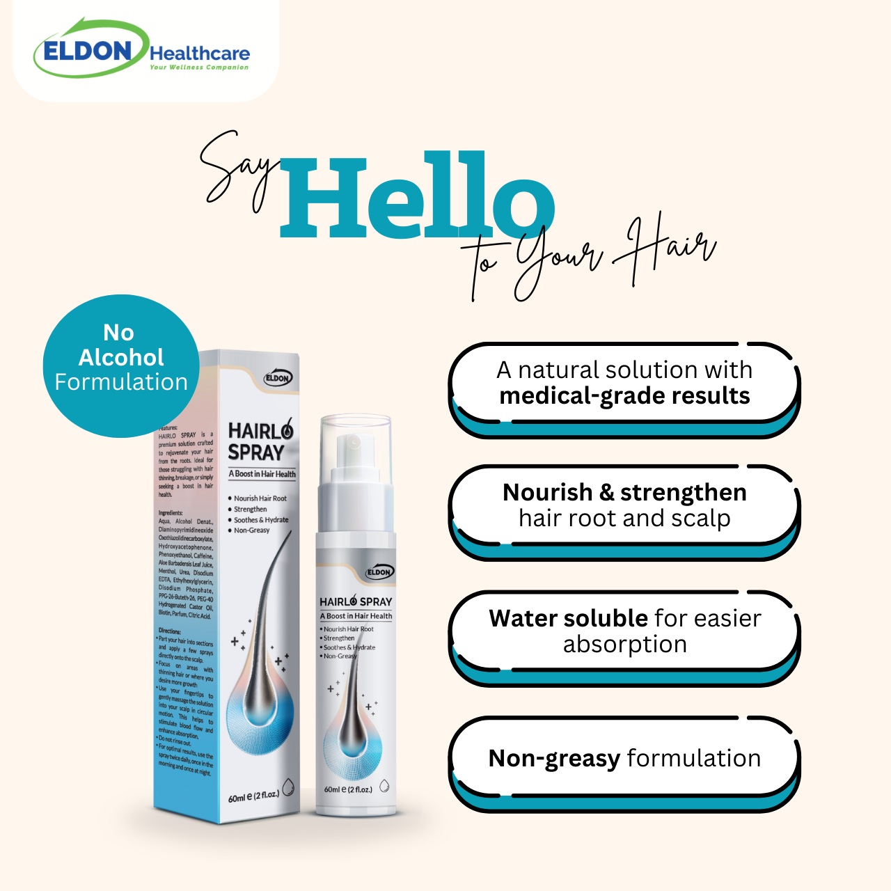 Eldon Hairlo Spray is designed to tackle the root causes of hair loss, delivering noticeable medical-grade results in at least 30 days. No more sighing, just stunning hair!