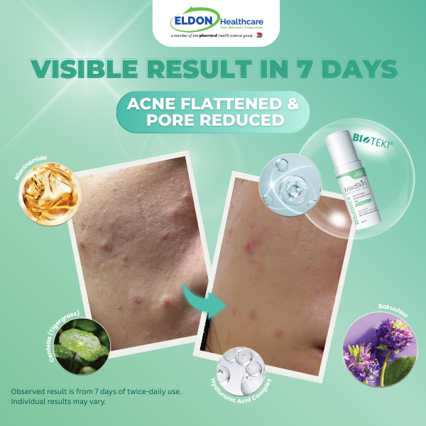 Eldon Medskin Mattifying Moisturisation Gel showed an incredible result in acne flattening, reduced pore, reduce sebum production (oil), and reduce redness.