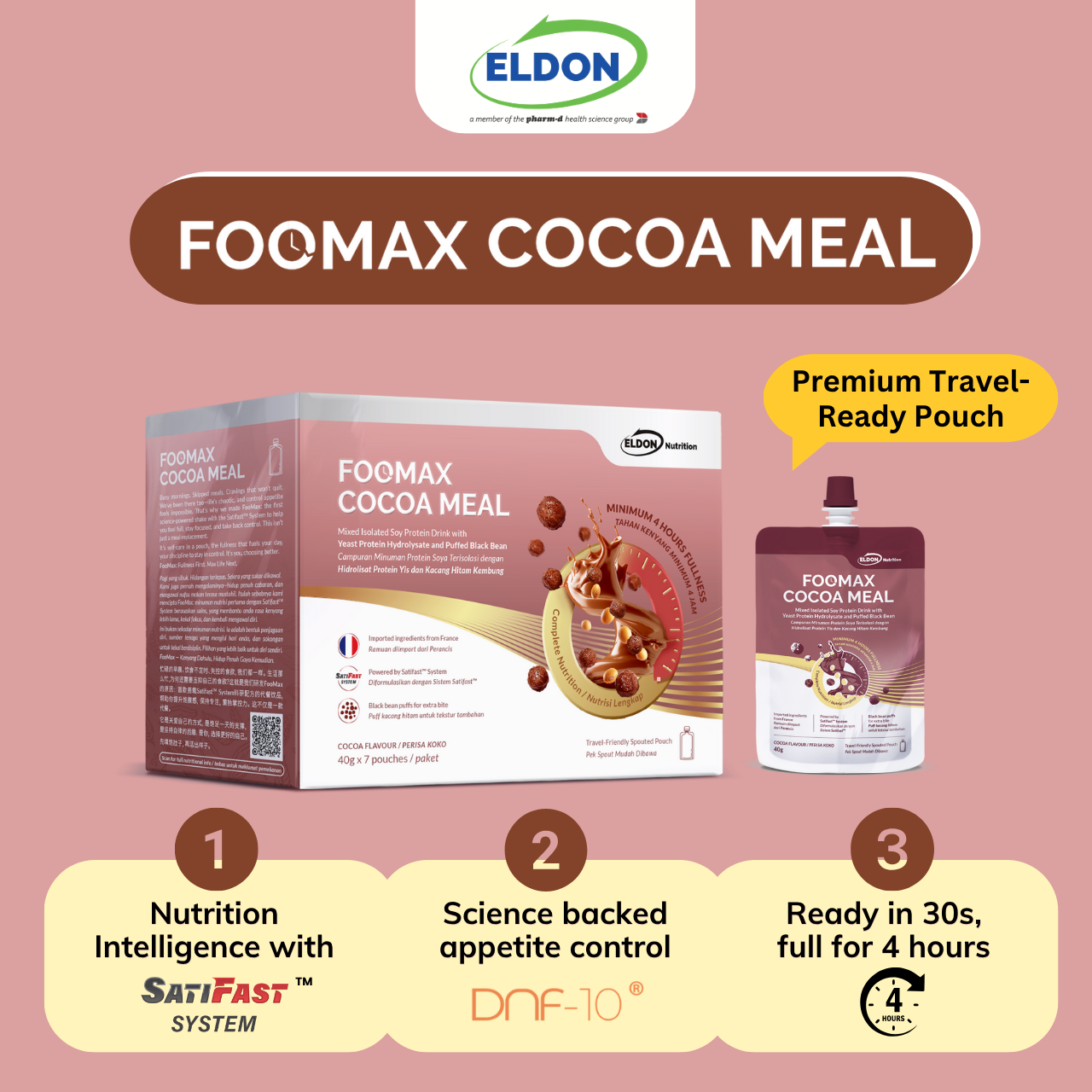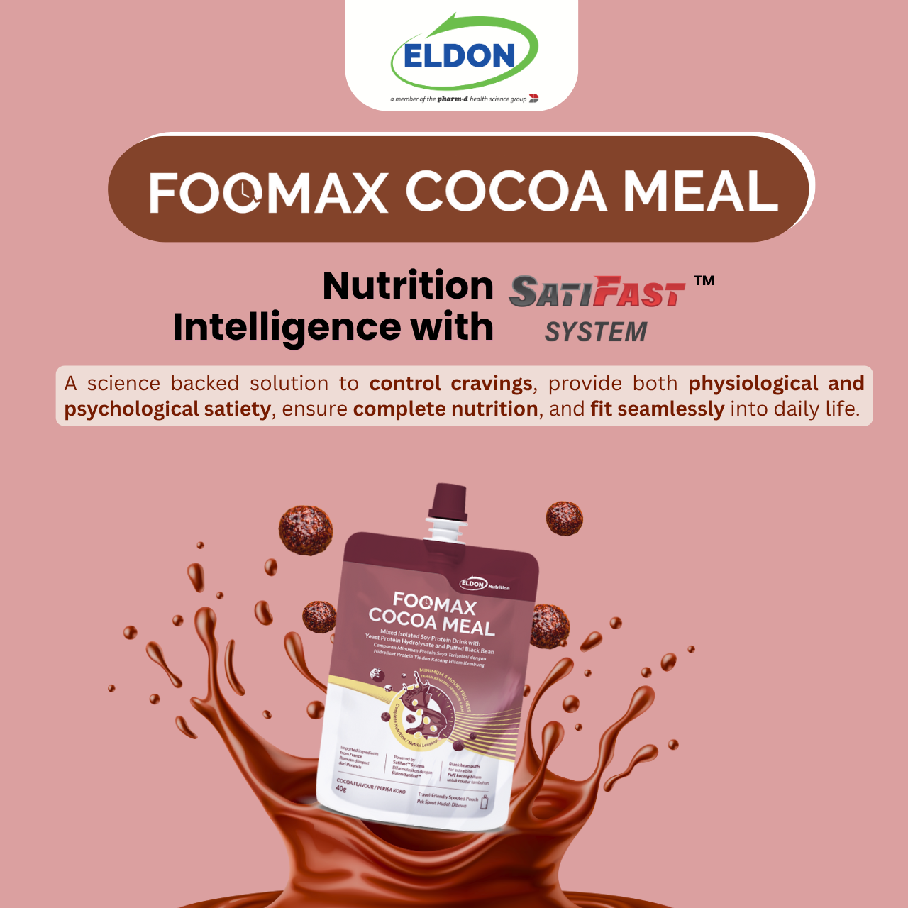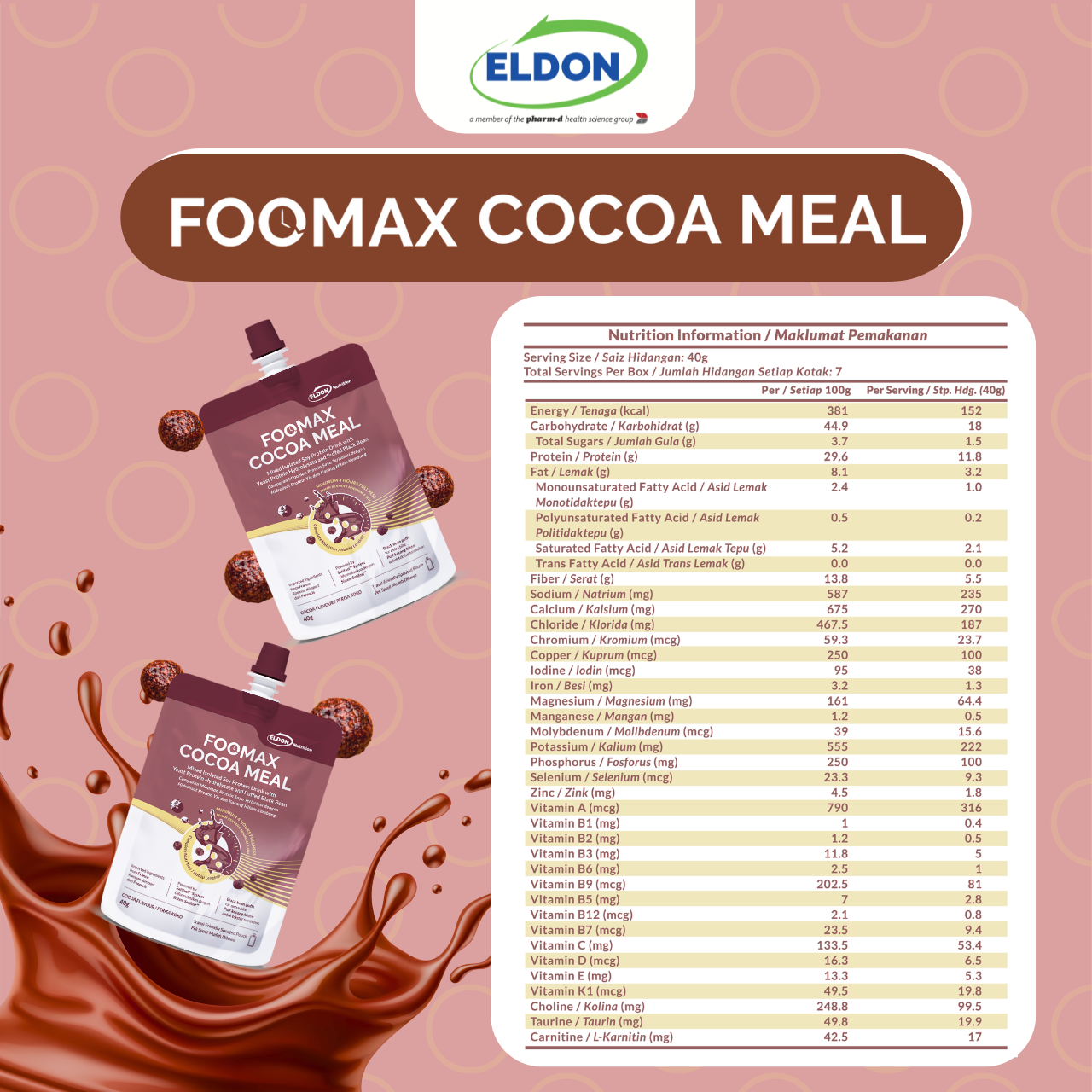 Eldon Nutrition FooMax Cocoa Meal is a appetite control meal replacement suitable for individual seeking for weight management, busy professionals & students and fitness & sports enthusiasts.