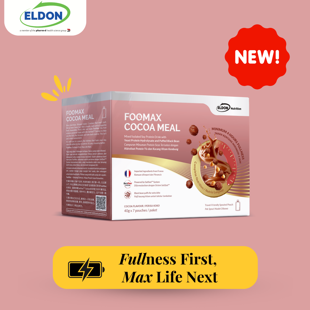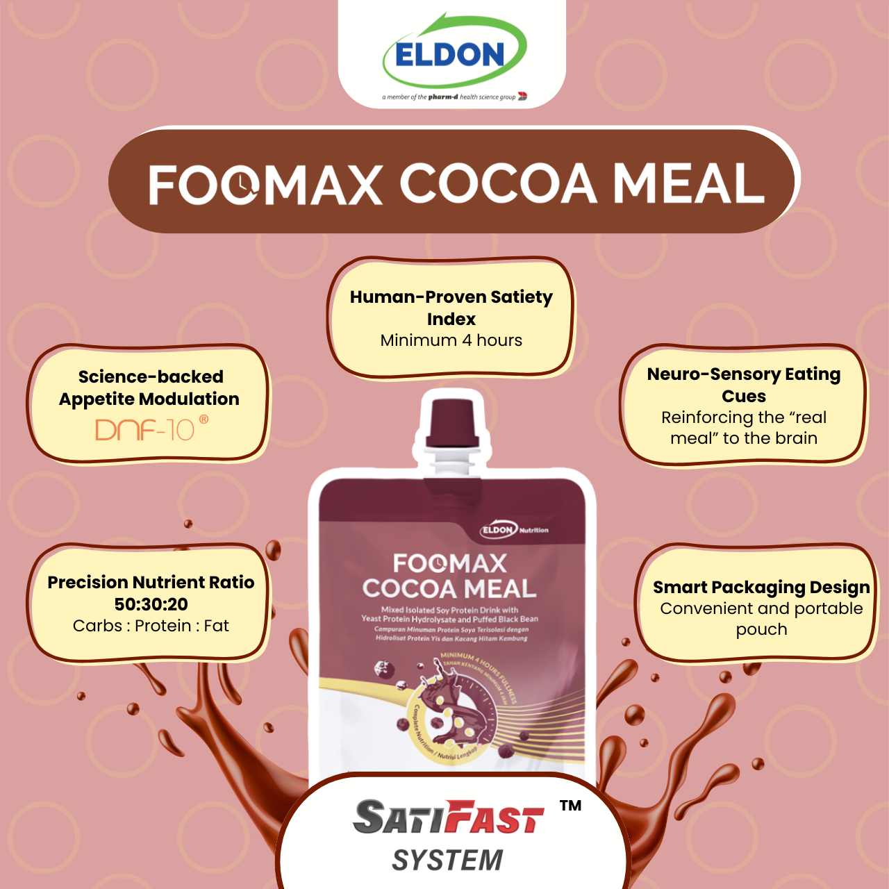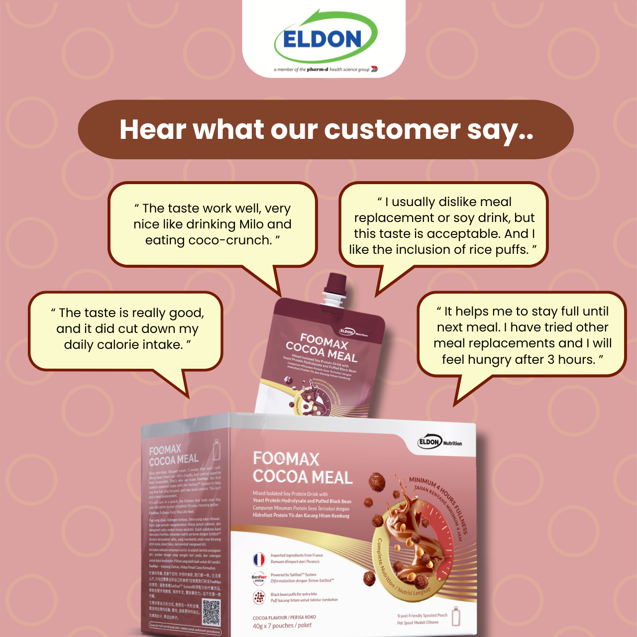 Eldon Nutrition FooMax Cocoa Meal is a appetite control meal replacement suitable for individual seeking for weight management, busy professionals & students and fitness & sports enthusiasts.