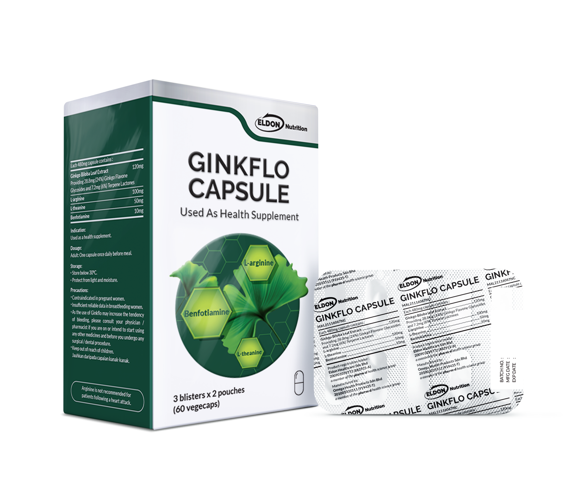 Ginkflo capsules are formulated with high strength Ginkgo Biloba, (standardized to contain 24% flavone glycosides and 6% terpene lactone), amino acids (L-Arginine, L-Theanine) and vitamin B (Benfotiamine), a non- drowsy formula that promotes blood circulation, improves concentration and reduce stress level during the busy periods.