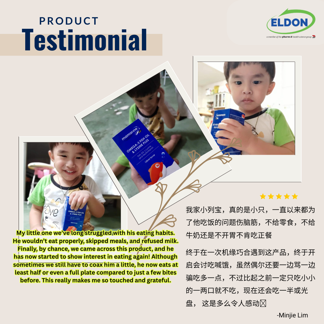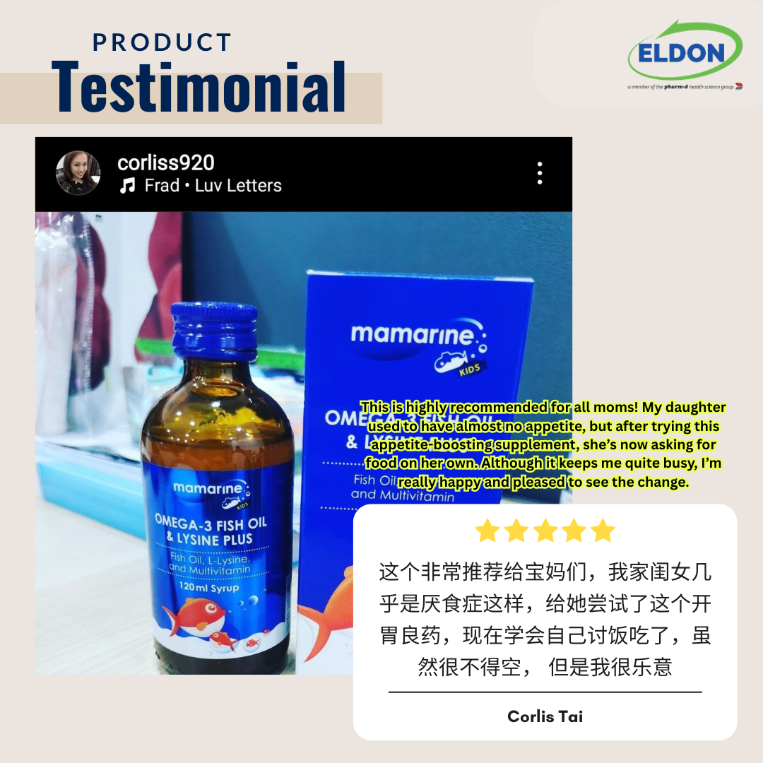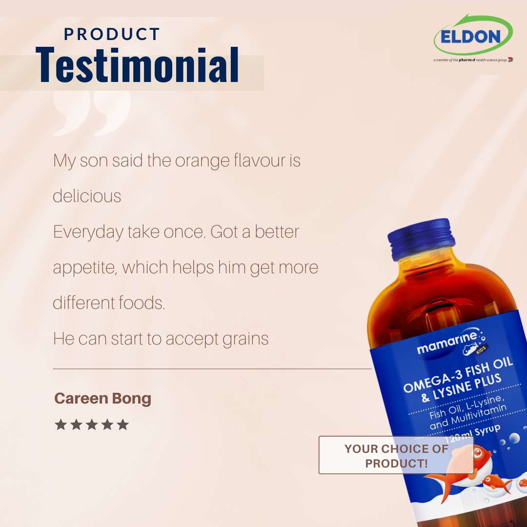 Mamarine Omega-3 Fish Oil & Lysine Plus is a delicious, orange flavoured, nutritional syrup which helps to fill the nutritional gaps and simultaneously promote healthy growth and development in children. With premium Omega-3 fish oil from Iceland and one of the highest strength of Lysine in the market, Mamarine is a choice that is perfect to ensure your child’s nutrition, growth and development, specially for those picky eaters.